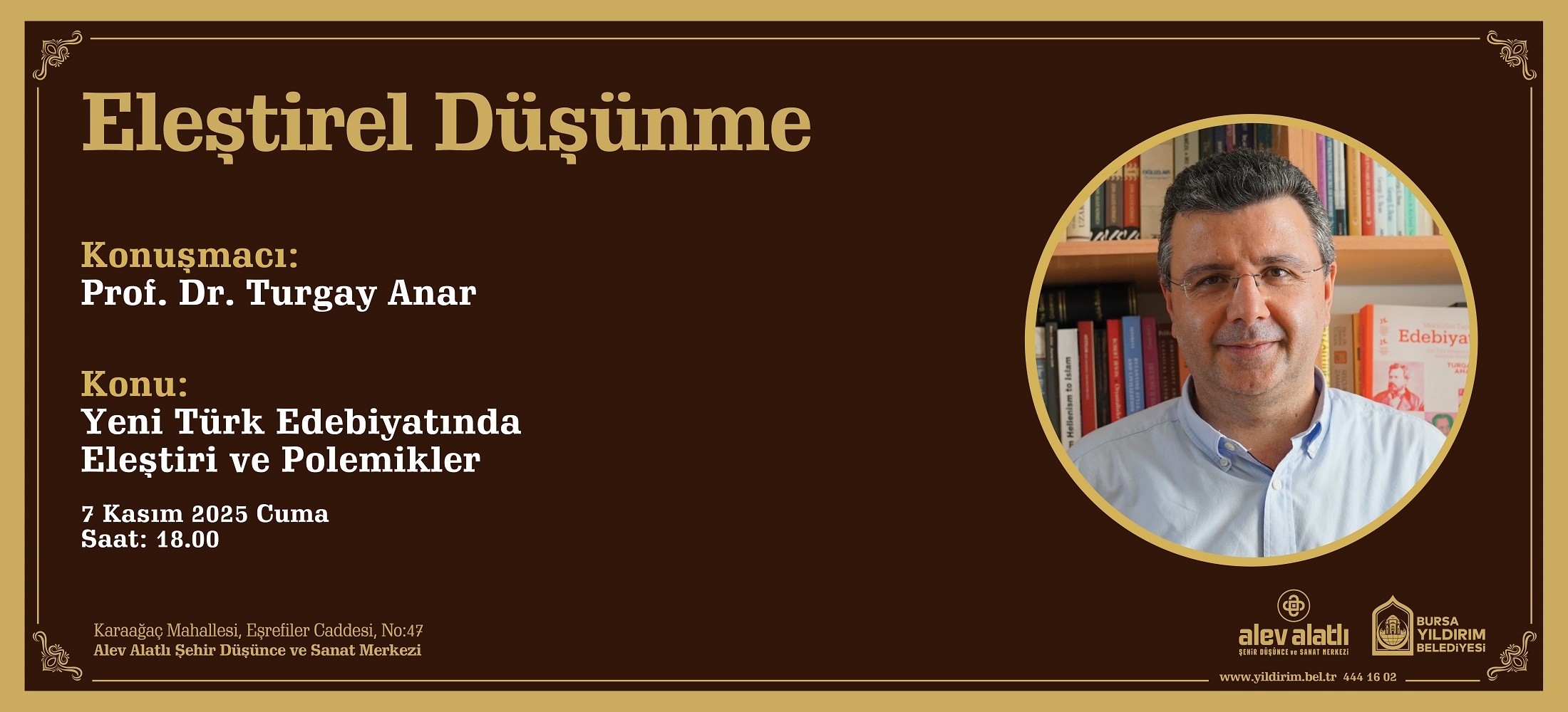 Yıldırım Belediyesi ve Alev Alatlı Şehir Düşünce ve Sanat Merkezi, “Eleştirel Düşünme” söyleşisinde Prof. Dr. Turgay Anar’ı konuk ediyor.