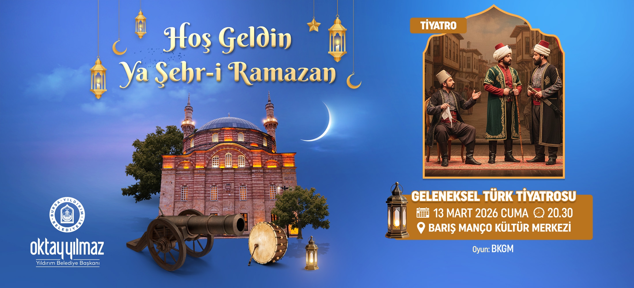 Yıldırım Belediyesi Ramazan etkinlikleri kapsamında sahnelenecek Geleneksel Türk Tiyatrosu, kültürümüzün köklü sahne sanatlarını izleyiciyle buluşturuyor. Geleneksel karakterler, dönem atmosferi ve sahne performansıyla program; hem nostaljik hem de eğlenceli bir tiyatro akşamı sunmaktadır.