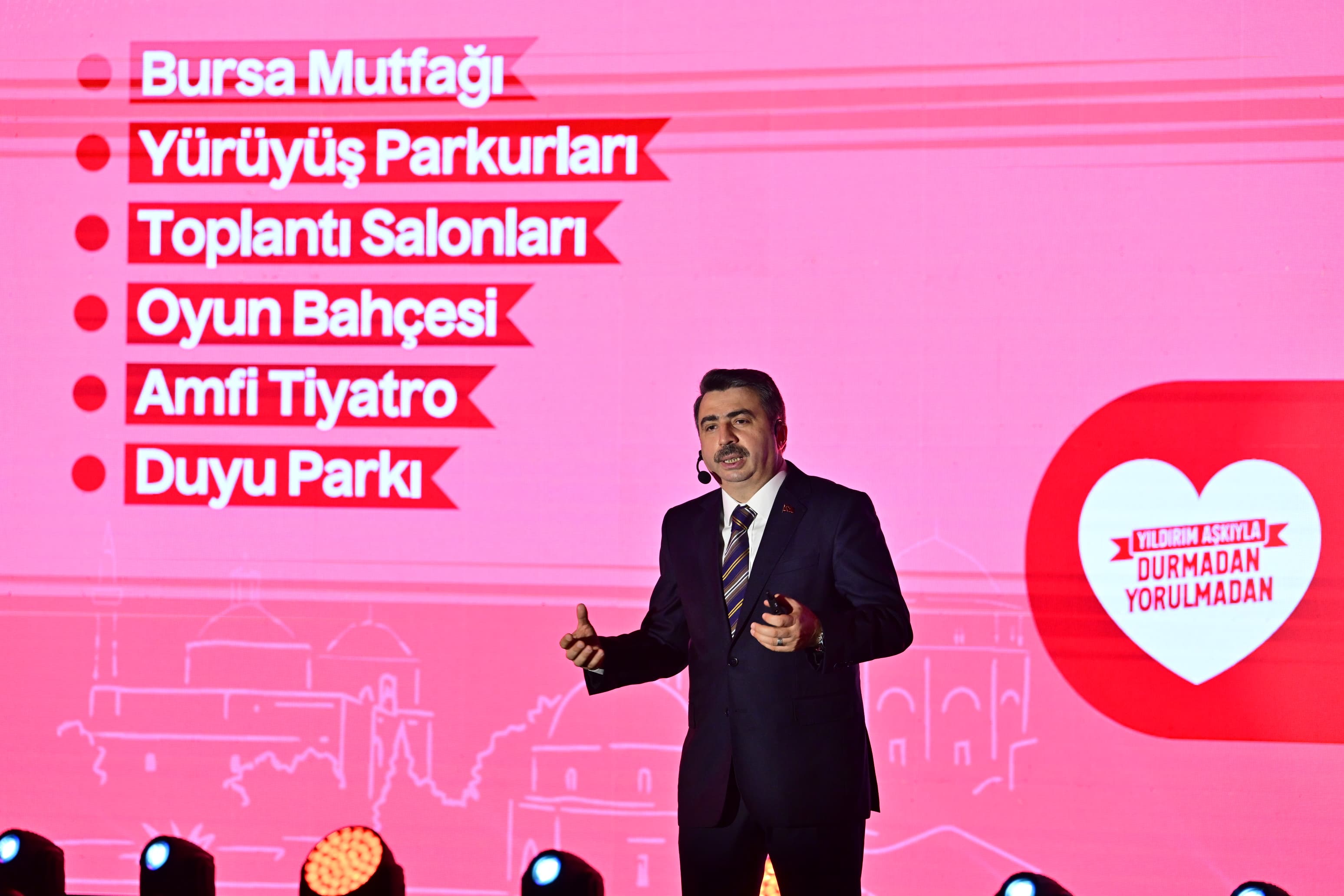 Yeşil alan çalışmaları hakkında da bilgi veren Başkan Yılmaz; “Yıldırım’ın yüzölçümü Bursa’nın yüzölçümünün yüzde biri. Bu kadar küçük bir bölgede yeşil alan üretmek oldukça zor. Göreve gelirken kişi başı 1 metrekare yeşil alan hedefi koymuştuk. Hamdolsun bu hedefi aştık ve toplamda 1 milyon metrekareden fazla yeşil alan ürettik. Balaban, Cumalıkızık gibi büyük kent parklarının yanı sıra 45 yeni mahalle parkı da yaptık. 71 parkı ise yeniledik. Şu anda çok özel bir proje olan Fetih Korusu’nu Yıldırım’a kazandırmak için çalışıyoruz. Küreklidere’de bir çocuk köyü inşa edeceğiz. Aliya İzzetbegoviç Parkı, Cumalıkızık Manej Alanı, Değirmenönü Orman Parkı, Engelsiz Yaşam Parkı, Kadıyayla Gençlik Kampı projelerimizle birlikte Yeşil Yıldırım imajını iyice güçlendireceğiz” dedi.