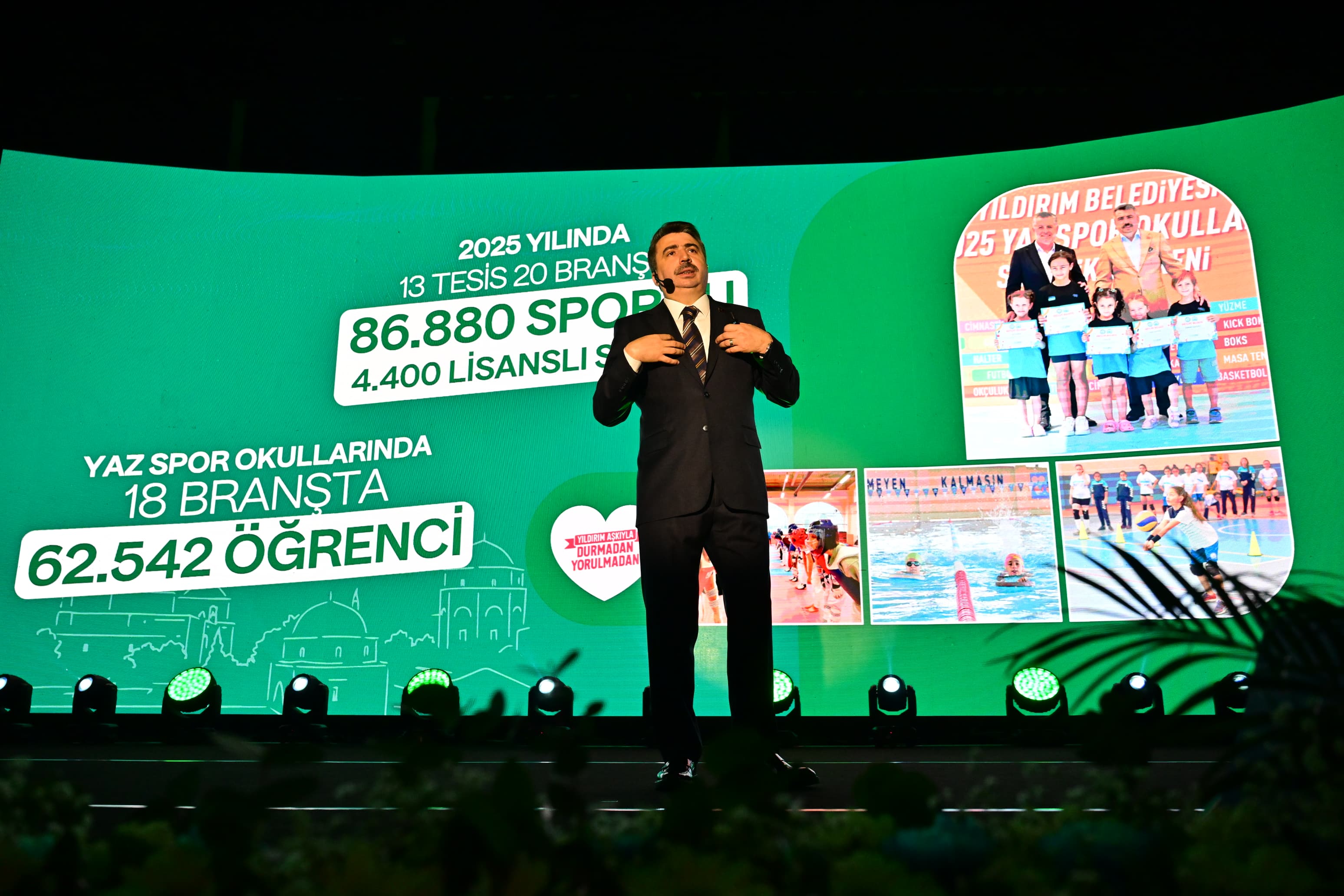Yıldırım’ın tüm kimliklerinin yanında bir de spor kenti kimliği olduğunu belirten Başkan Oktay Yılmaz; “Yıldırım’da 7’den 77’ye herkesin spor imkanına sahip olmasını istiyoruz ve bu doğrultuda çalışıyoruz. Sadece 2025 yılında, 13 tesis 20 farklı branşta 86 bin 880 vatandaşımıza spor hizmeti verdik. Yaz spor okullarında 62 binden fazla çocuğumuza spor eğitim hizmeti sağladık. Bugün Yıldırım’daki spor tesislerimiz tüm Bursa’ya hizmet vermektedir. Spora verdiğimiz destek ve yatırımlarımızın meyvelerini de alıyoruz. Bugüne kadar 129 ulusal ve uluslararası organizasyona ev sahipliği yaptık. Sporcularımız 186 Türkiye derecesi, 5 dünya derecesi, 35 Avrupa- Balkan derecesi- 35 farklı uluslararası derece ve yüzlerce bölge ve Bursa derecesi elde etti” diye konuştu.