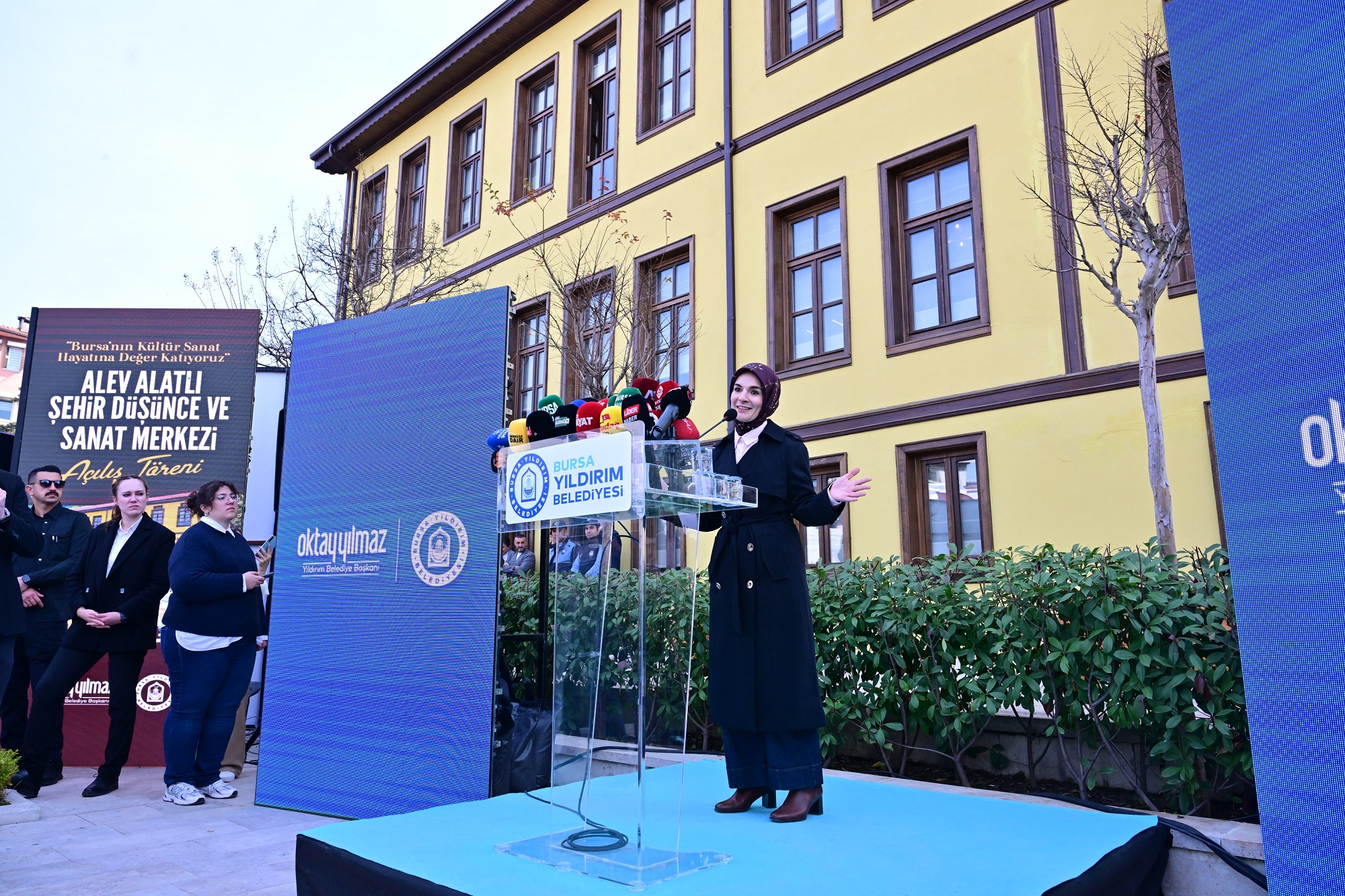 Yıldırım Belediyesi’nin, ilçeye kazandırdığı Alev Alatlı Şehir Düşünce ve Sanat Merkezi düzenlenen törenle hizmete açıldı. Yıldırım Belediye Başkanı Oktay Yılmaz’ın ev sahipliğinde düzenlenen açılışa; Aile ve Sosyal Hizmetler Bakanı Mahinur Özdemir Göktaş, AK Parti Genel Başkan Vekili ve Bursa Milletvekili Efkan Ala, Bursa Valisi Erol Ayyıldız, AK Parti Bursa milletvekilleri Emine Yavuz Gözgeç, Refik Özen, Ayhan Salman, Ahmet Kılıç, Yıldırım Kaymakamı Metin Esen, Üsküdar Kaymakamı Adem Yazıcı, AK Parti Yerel Yönetimler Başkan Yardımcısı Recep Altepe, AK Parti İl Başkanı Davut Gürkan, Alev Alatlı’nın kızı Funda Aktan, Keles Belediye Başkanı Ferhat Erol, Bursa Kültür Varlıklarını Koruma Kurulu Müdürü Erdal Çetindağ, Bursa Emniyet Müdürü Kadir Gökçe, Bursa Teknik Üniversitesi Rektörü, Prof. Dr. Naci Çağlar, AK Parti Yıldırım İlçe Başkanı İrfan Akkaya, AK Parti Osmangazi İlçe Başkanı Adnan Kurtuluş, AK Parti Nilüfer İlçe Başkanı Furkan Alparslan, Gemlik Belediye Başkanı Şükrü Deviren, Bursa Ticaret ve Sanayi Odası Başkanı İbrahim Burkay, Aile ve Sosyal Hizmetler İl Müdürü Faruk Uysal, Karaağaç Mahalle Muhtarı Sema Pamukçular, akademisyenler, STK temsilcileri ve vatandaşlar katıldı.