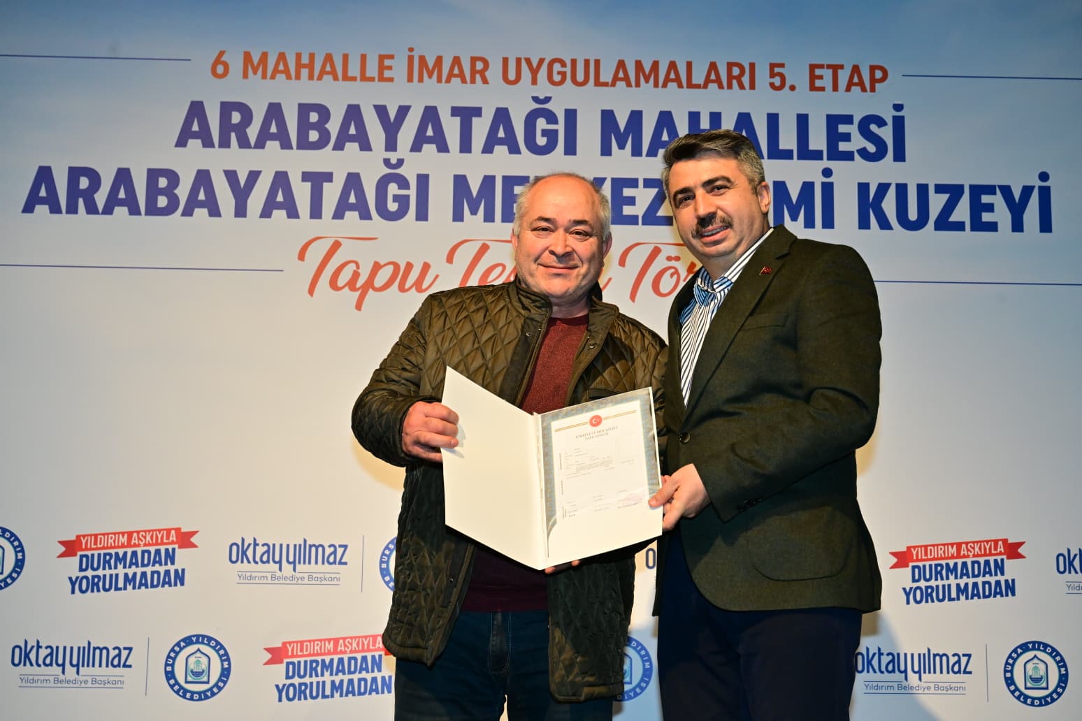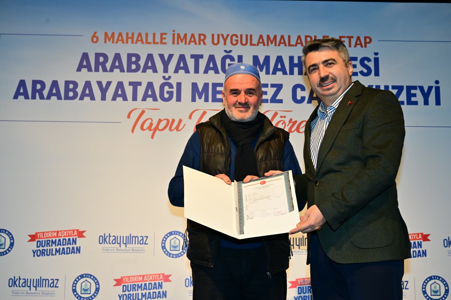 Yıldırım Belediyesi, 6 Mahalle İmar Uygulamaları kapsamında Arabayatağı, Çınarönü, Ulus, Yavuzselim, Mevlâna, Hacivat mahallelerinde 7 bin 417 tapu dağıtılırken, 18 bin 950 tapunun da işlemlerini tamamladı.