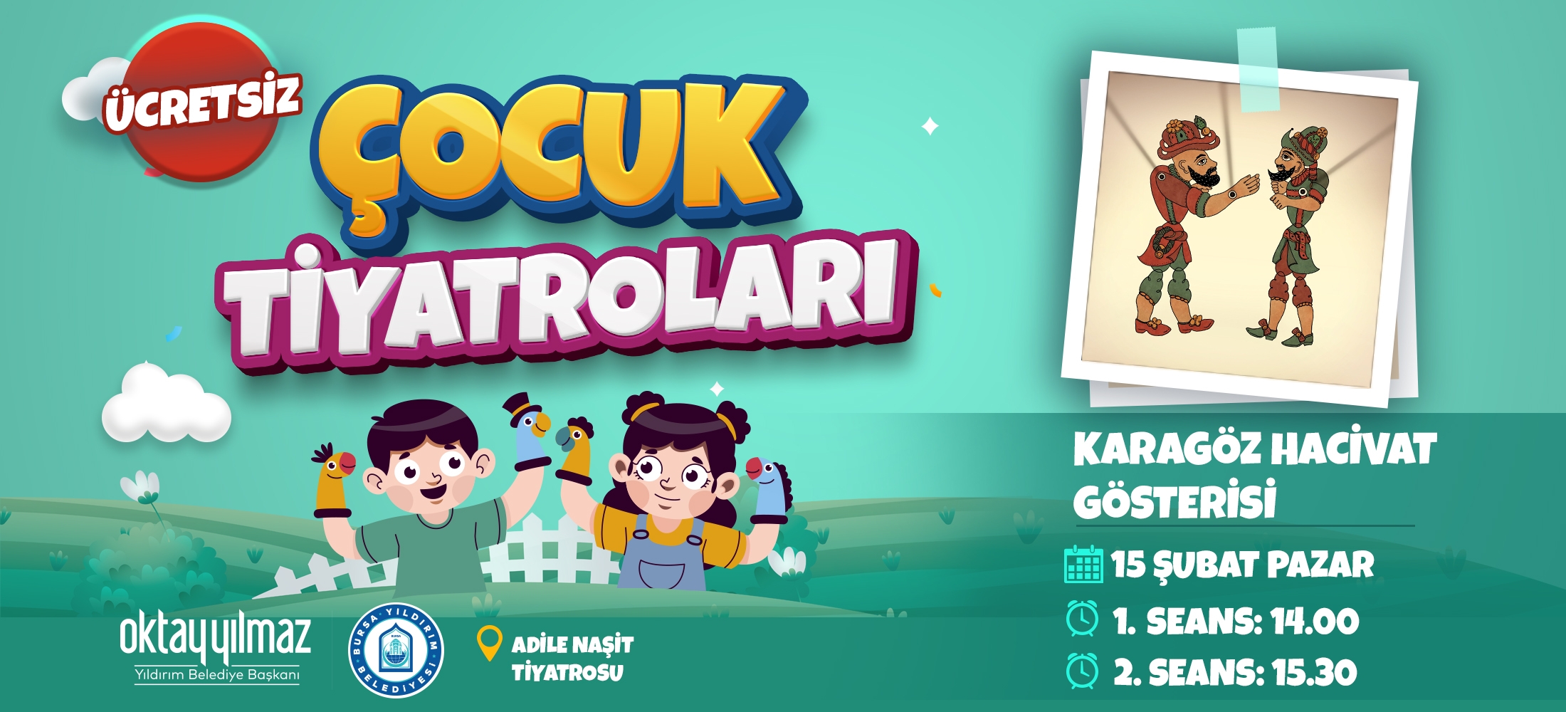Yıldırım Belediyesi Kültür Sanat etkinlikleri kapsamında gerçekleştirilecek Karagöz Hacivat Gösterisi, geleneksel Türk gölge oyununun eğlenceli dünyasını çocuklarla buluşturuyor. Kültürel değerlerimizi yaşatmayı amaçlayan gösteri, mizah ve öğretici anlatımıyla çocuklara unutulmaz bir tiyatro deneyimi sunmaktadır.