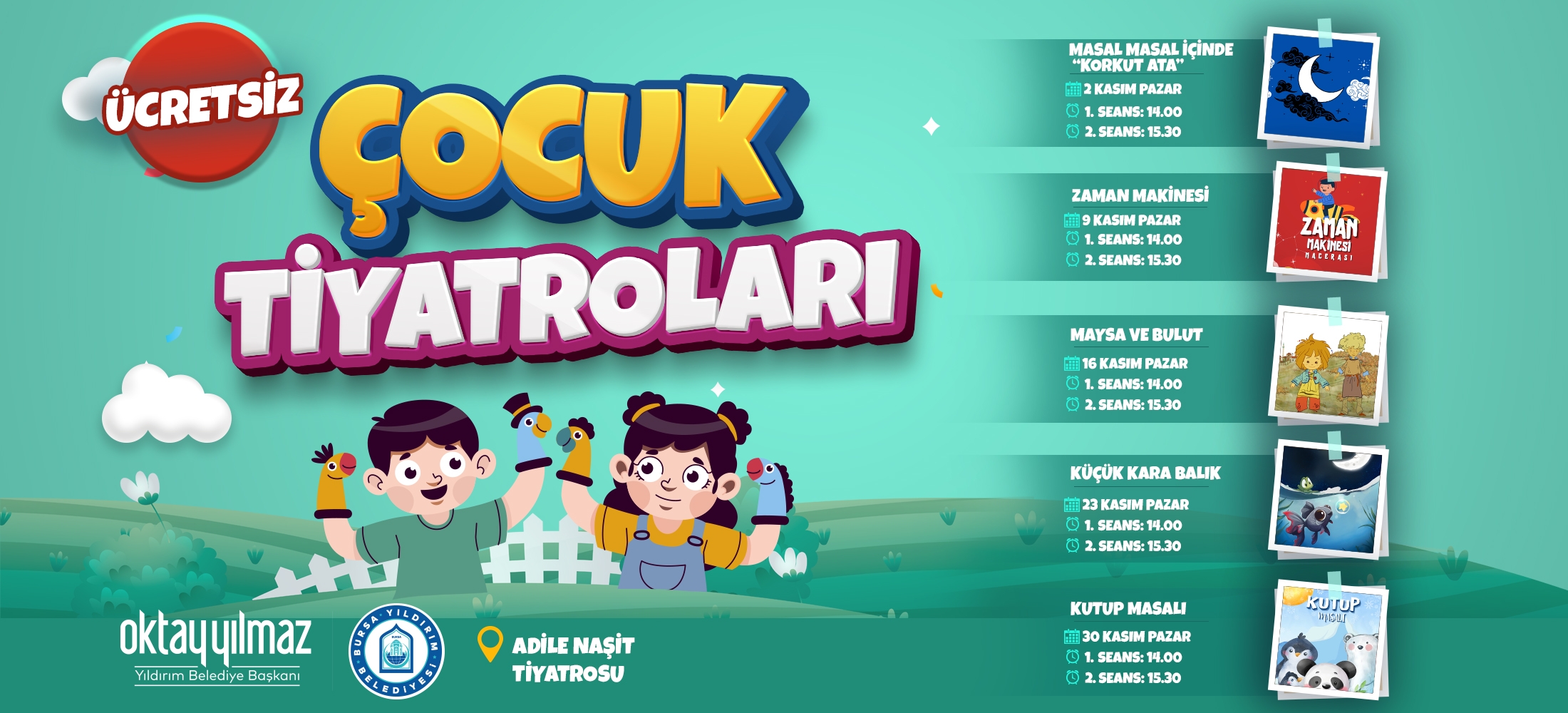 Yıldırım Belediyesi’nin düzenlediği ücretsiz çocuk tiyatrolarıyla, minik tiyatroseverler Kasım ayı boyunca sahnenin büyülü dünyasında keyifli vakit geçirmeye devam ediyor.